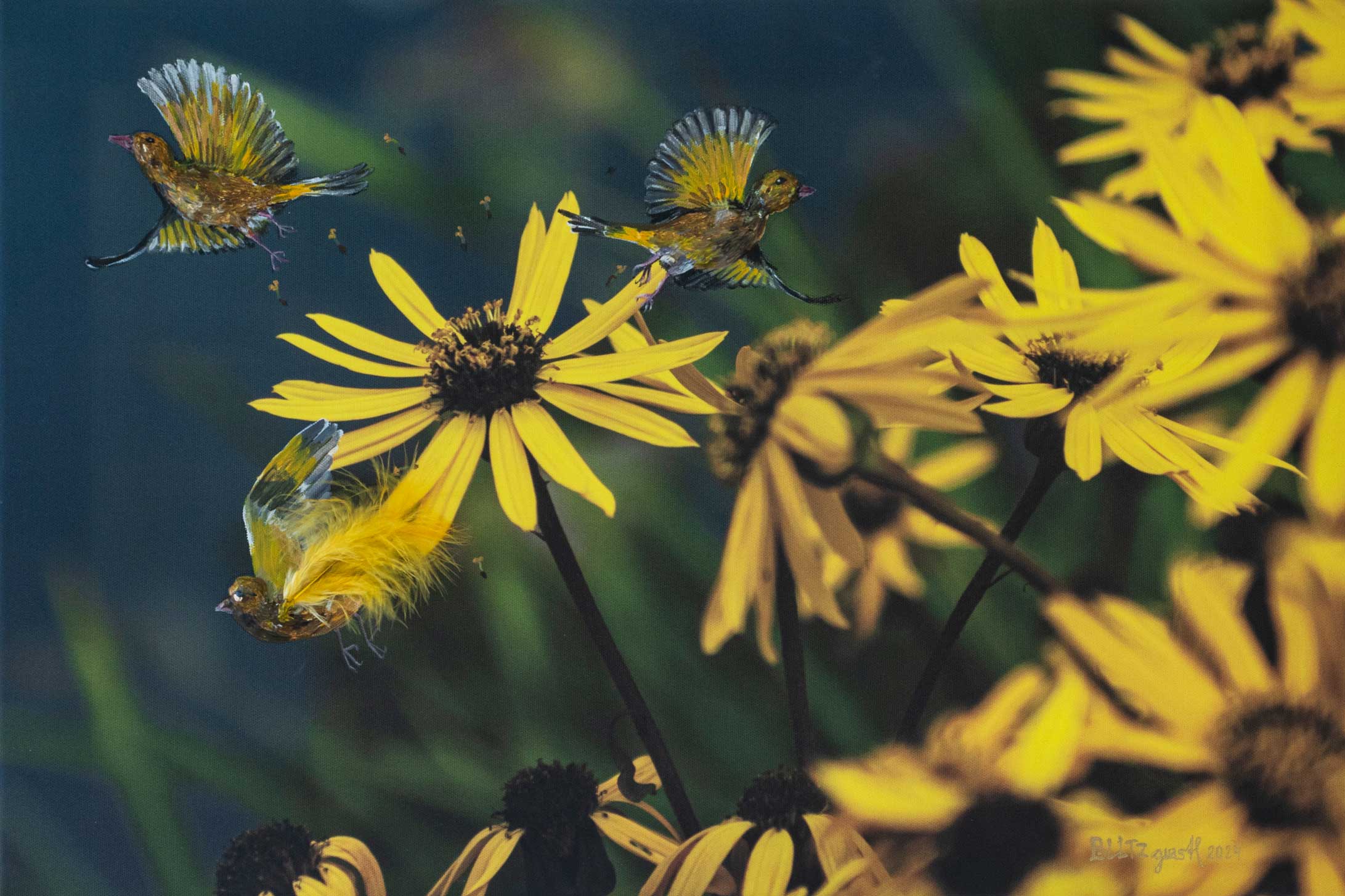 Kombination: Mischtechnik (Acrylmalerei, Spachtelmasse und Kunstfedern mit 3D-Effekt) auf Foto-Leinwand